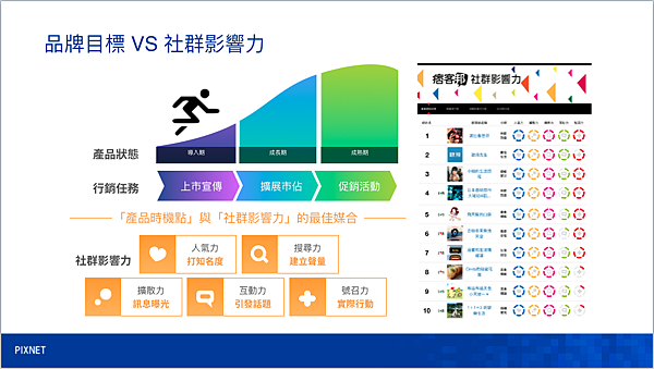 依照產品的生命週期,各階段的行銷目標也有所不同,一般來說,新產品上市時,與意見領袖(KOL)、知名網紅合作,能在短時間內創造聲量、打開知名度。當消費者對於產品已有基礎認知、但尚無品牌忠誠度時,網路上是否能搜尋到相關內容、口碑評價好壞,經常影響著大眾的消費決策,因此,在「擴展市佔」的階段,微網紅、素人部落客的口碑扮演關鍵的作用。